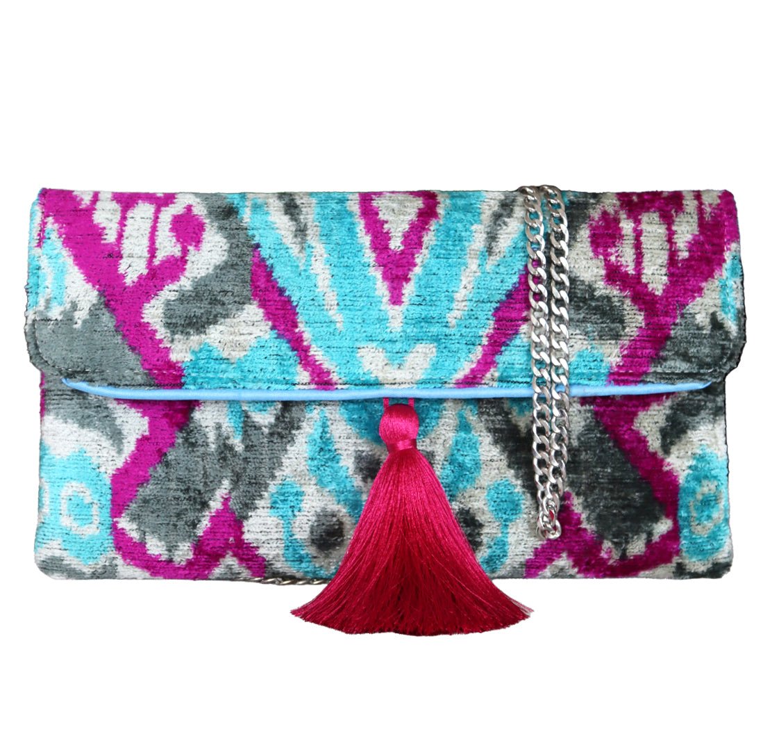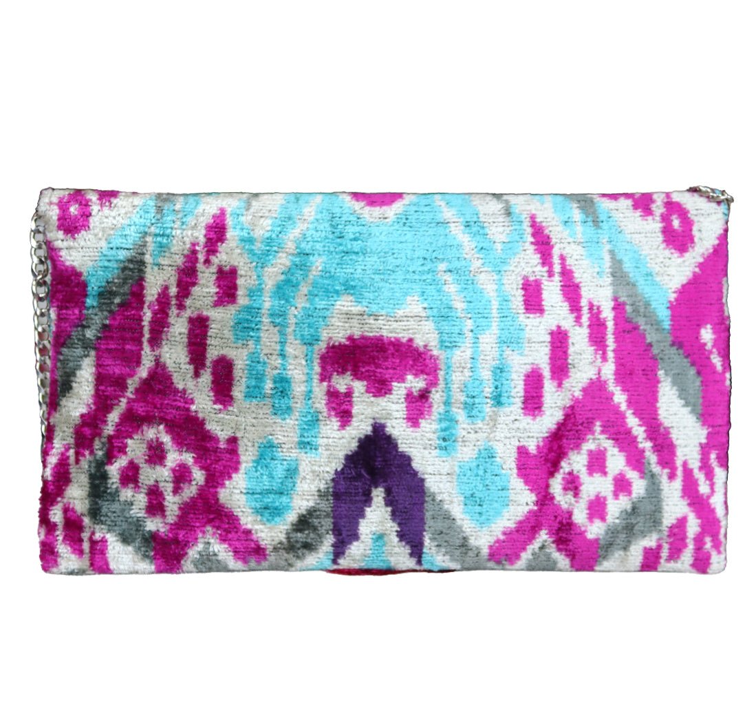 - Clutch de terciopelo de seda ikat hecho a mano.