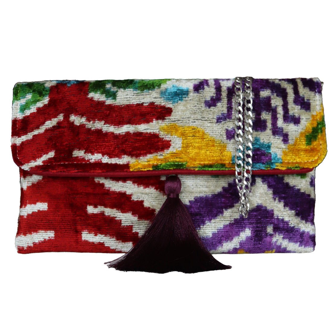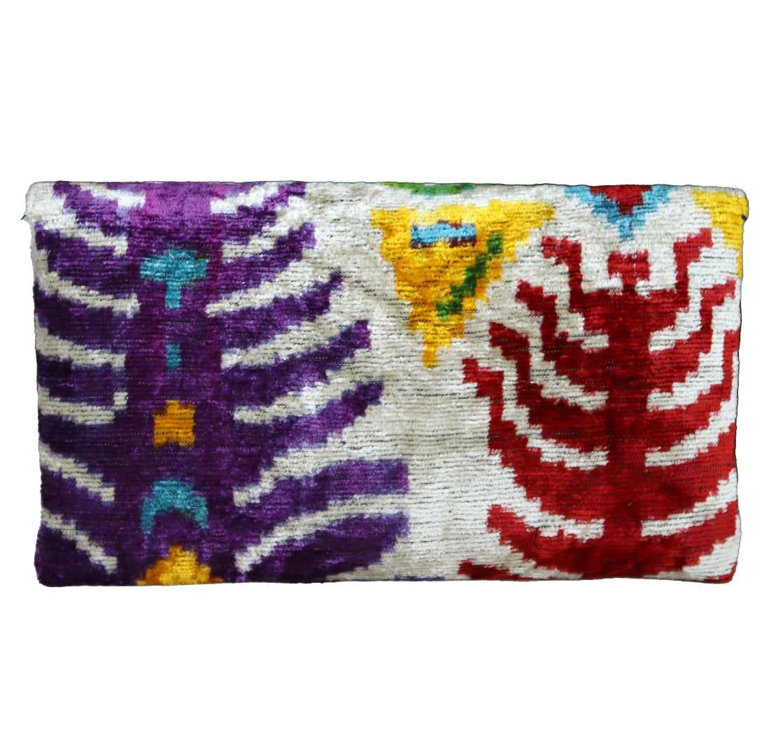 - Clutch de terciopelo de seda ikat hecho a mano.