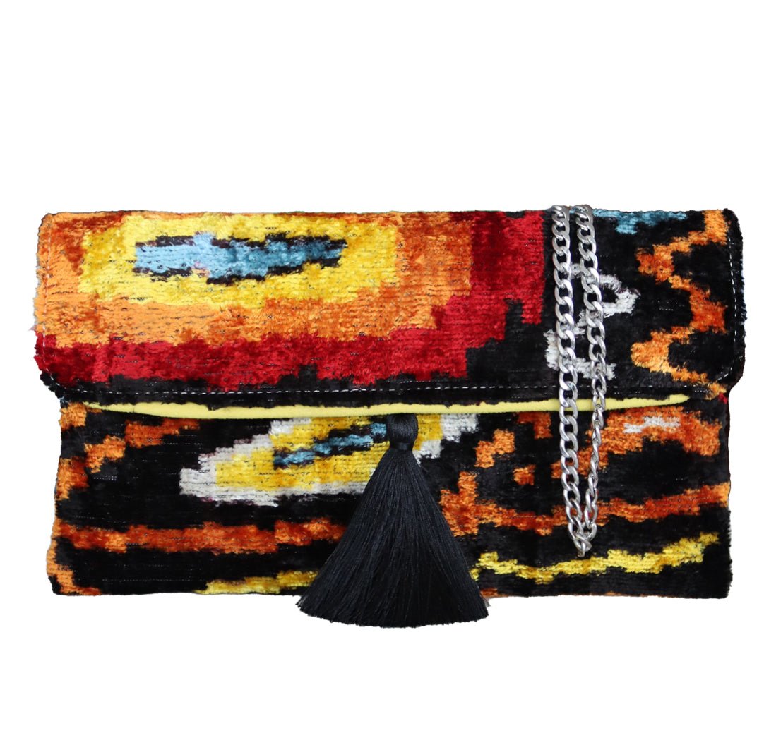 - Clutch de terciopelo de seda ikat hecho a mano.