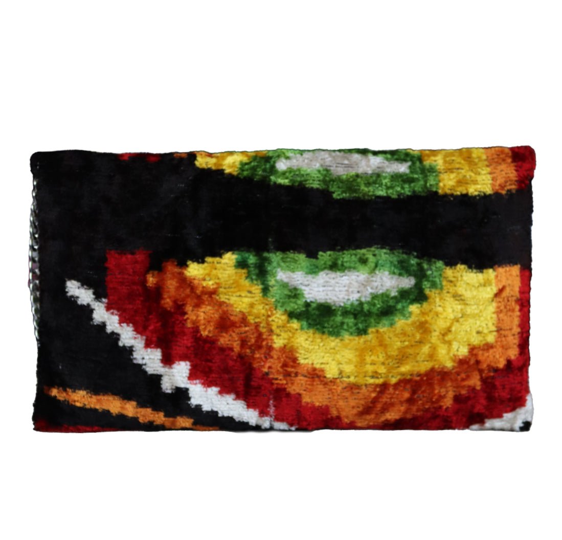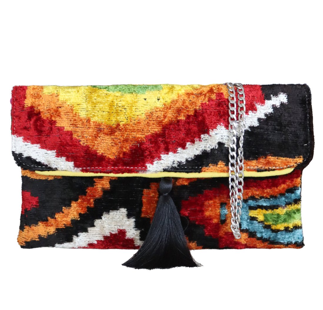 - Clutch de terciopelo de seda ikat hecho a mano.