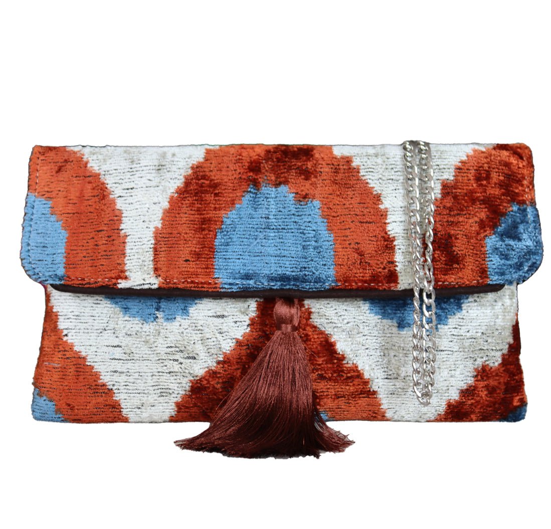 - Clutch de terciopelo de seda ikat hecho a mano.