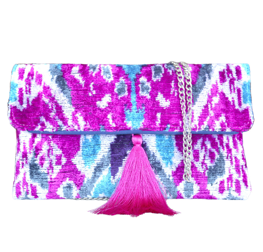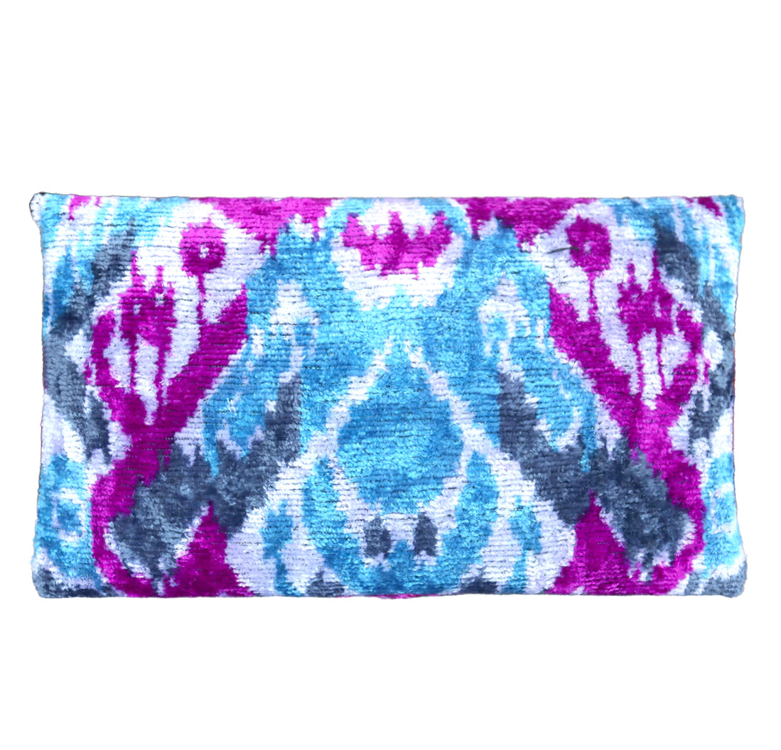 - Clutch de terciopelo de seda ikat hecho a mano.