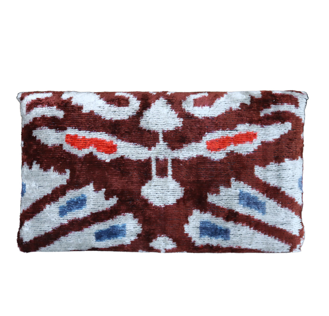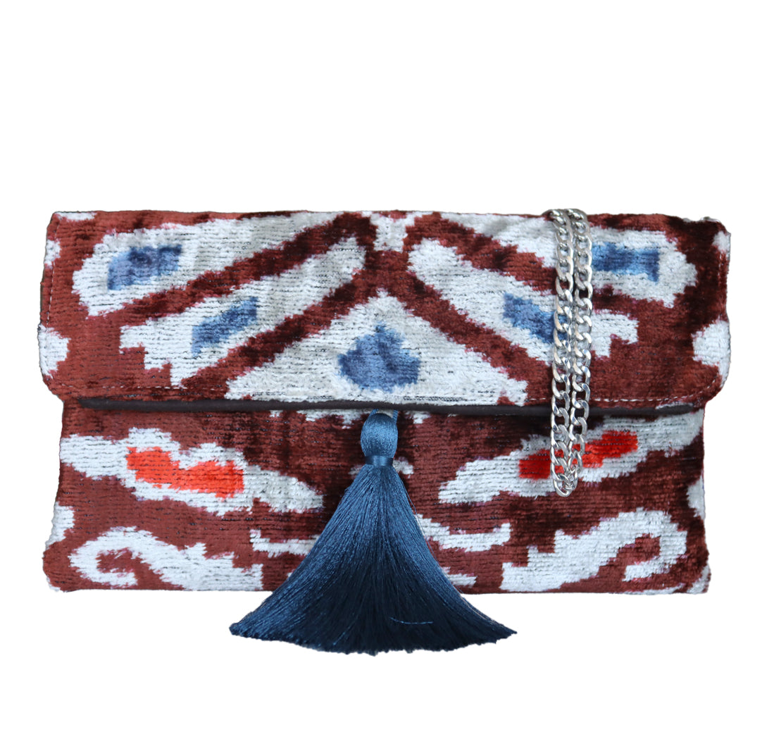 - Clutch de terciopelo de seda ikat hecho a mano.