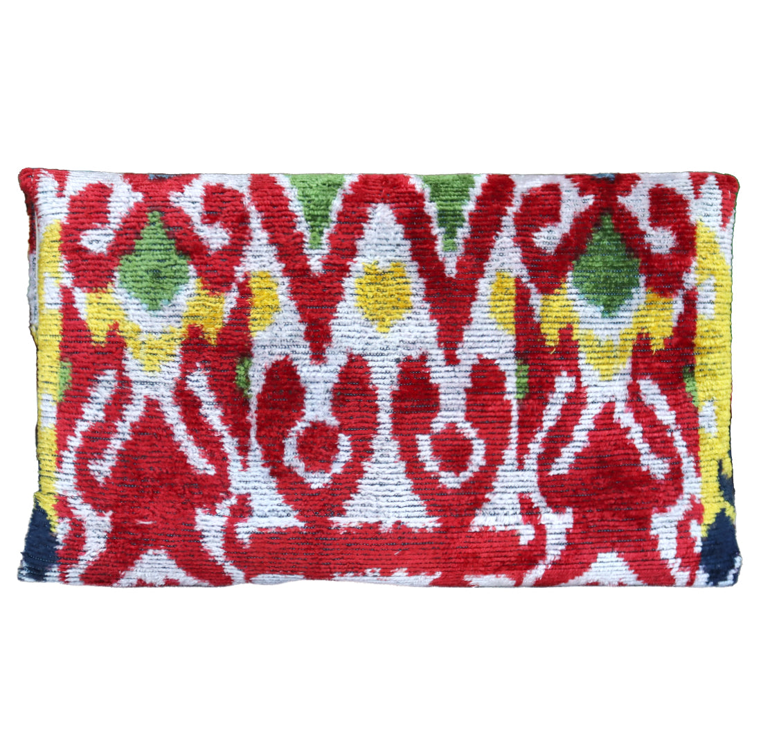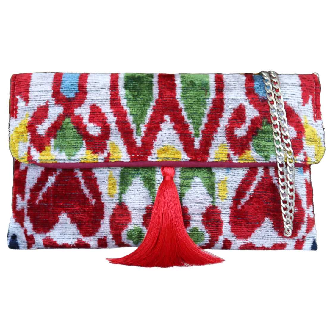 - Clutch de terciopelo de seda ikat hecho a mano.