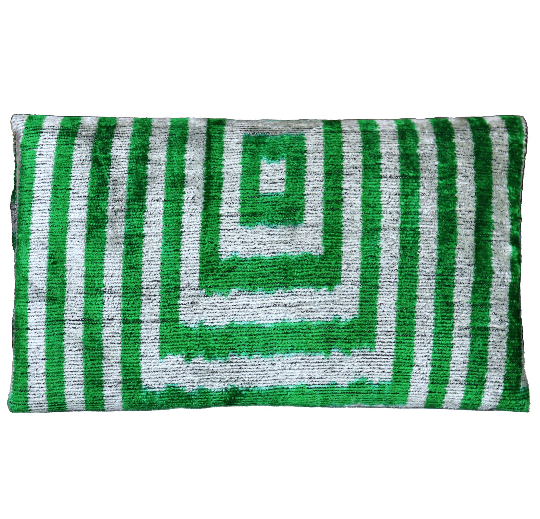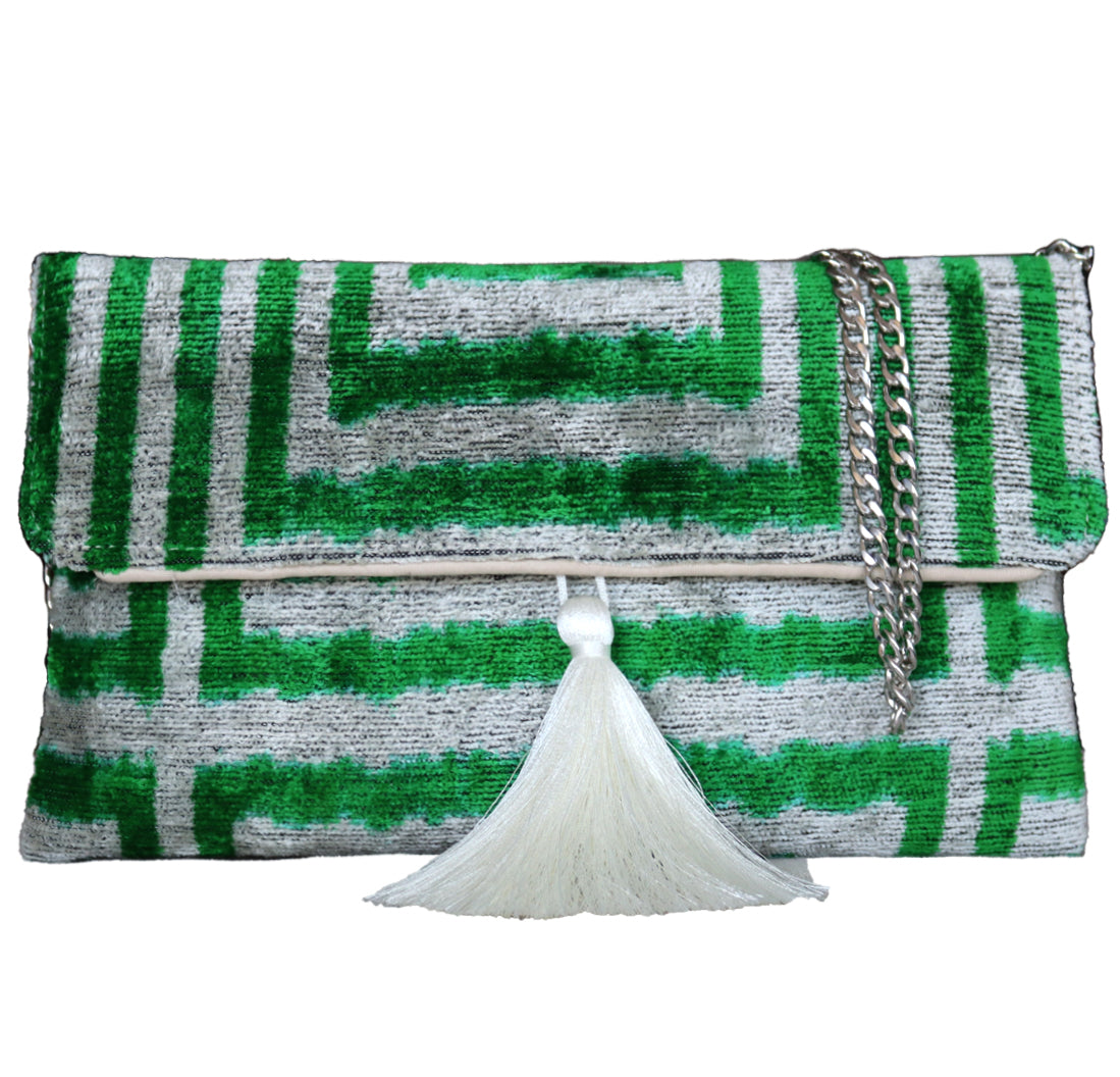 - Clutch de terciopelo de seda ikat hecho a mano.