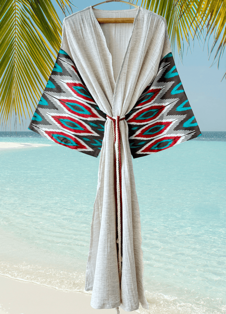 Adopte la elegancia natural con esta impresionante bata de muselina de seda ikat , diseñada para escapadas soleadas y una relajación de lujo. Con un cuerpo de muselina color crudo, ligero y transpirable, y coloridos y llamativos paneles de seda con estampado ikat en las mangas, este caftán fusiona la tradición artesanal con el estilo resort contemporáneo.