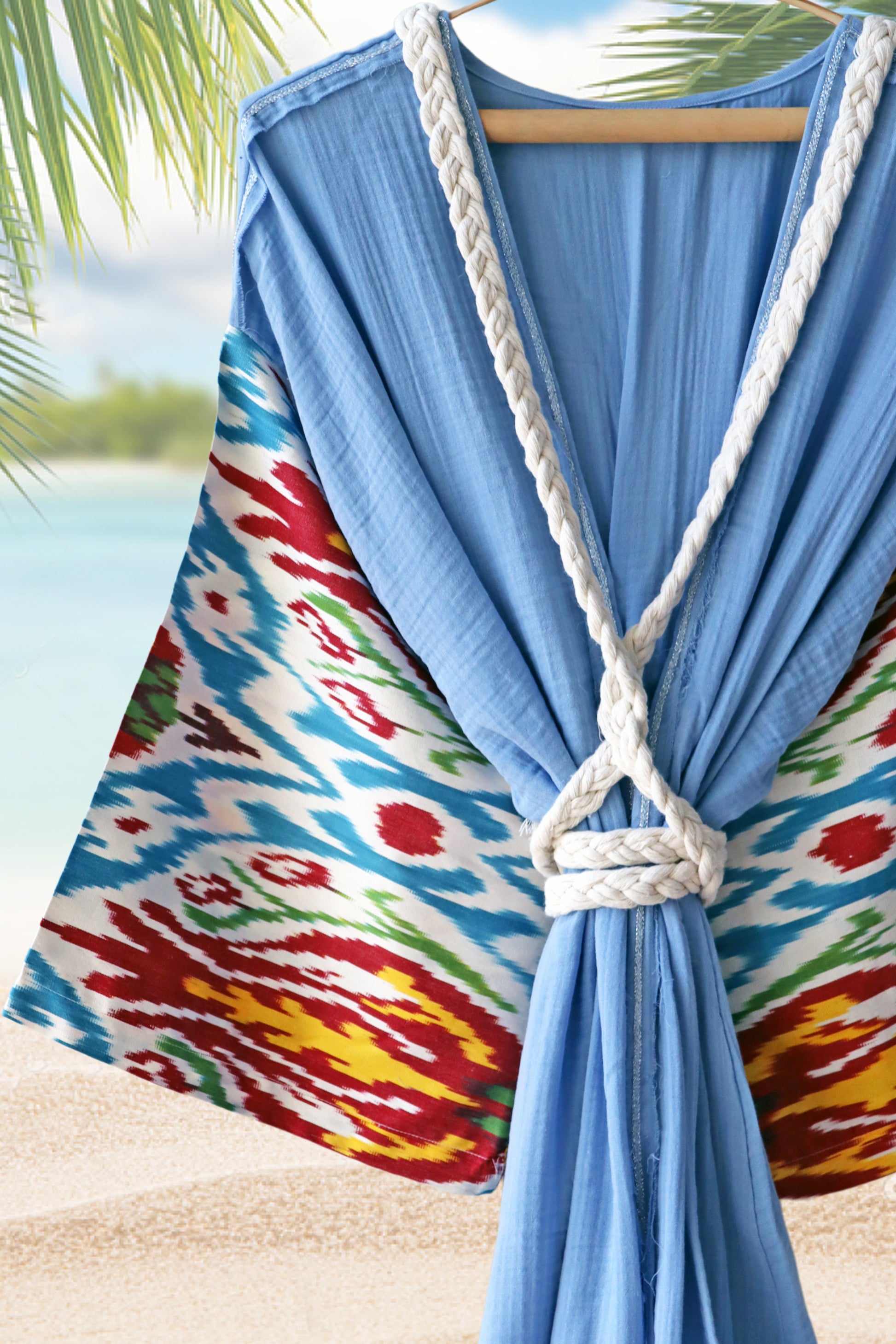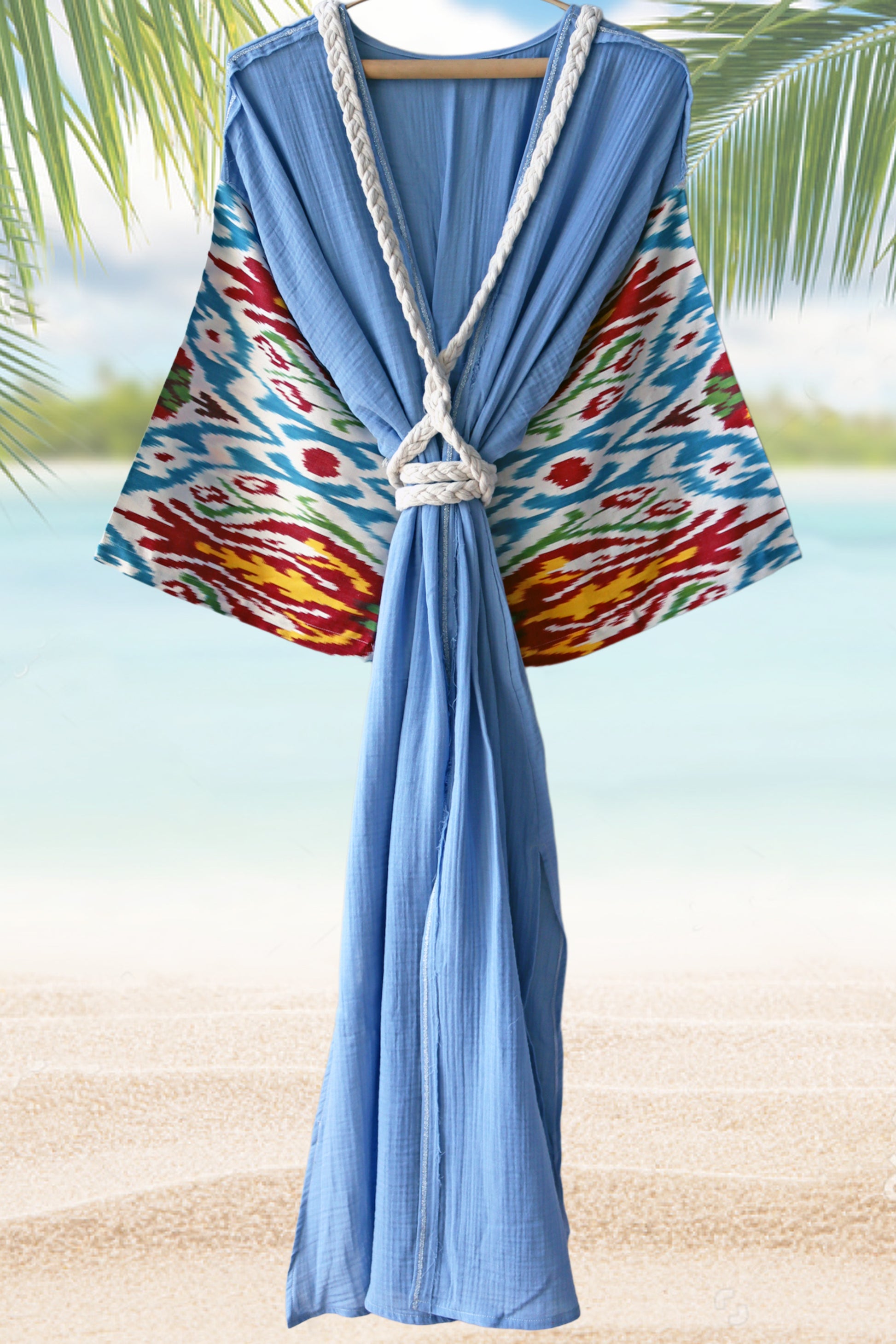 It’s made from handwoven silk ikat and organic soft müslin cotton robe/kimono.